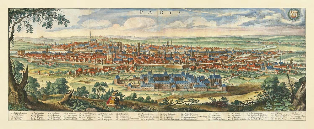 Un mapa de pájaros maravillosamente colorido, interesante y antiguo de París, publicado por Matthaus Merian en 1648. Este es uno de los mapas más antiguos de París.