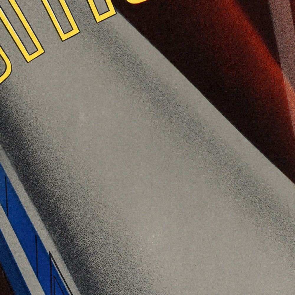 Though the original studio is lost to history, the poster clearly reflects the work of a skilled commercial illustrator immersed in Art Deco’s visual language. Railway publicity departments of the 1930s–50s often employed such artists to translate engineering feats into compelling imagery, using airbrush gradients, lithographic finesse, and confident, geometric lettering. This anonymous hand mastered the balance between sleek mechanical forms and elegant graphic minimalism—hallmarks of the period’s best transport design.