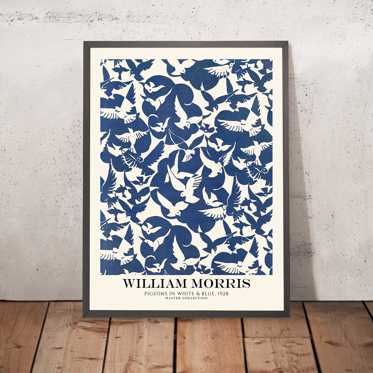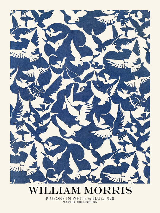 If you wish, we can add the artist’s name and the pattern title—“William Morris” and “Pigeons in White & Blue”—above or below the artwork. It’s a subtle detail that can visually anchor a gallery wall, echo a vintage sample book, or simply lend a touch of curatorial flair.
