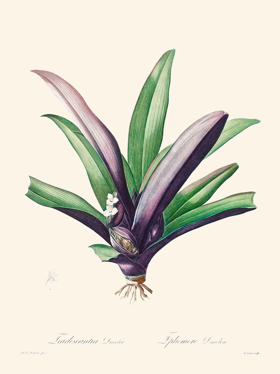 Esta obra de arte en particular se destaca no solo por su importancia histórica, sino también por su sorprendente estética. La ilustración botánica victoriana captura la intrincada belleza de la Tradescantia Discolor, o comúnmente conocida como Moisés en la cuna, con su rica y vibrante paleta de colores. El uso magistral del color y el detalle por parte de Redouté da vida a la combinación de morados profundos y verdes exuberantes característicos de esta planta exótica, lo que hace que cada impresión sea un deleite visual.