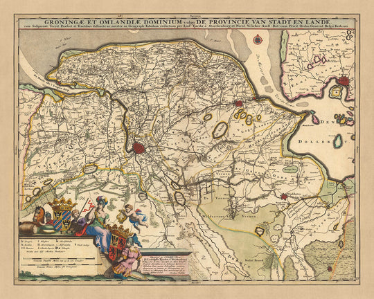 Este magnífico mapa, titulado 'Groningae et Omlandiae Dominium, vulgo De Provincie van Stadt en Lande', es un rico documento histórico que captura la esencia de Groningen y Omland, una región que ahora forma parte de los Países Bajos modernos. El título se traduce como "El Dominio de Groningen y Omland, comúnmente conocido como La Provincia de Ciudad y Tierra". Fue elaborado en 1690 por Nicolaes Visscher II, un renombrado cartógrafo de la ilustre familia Visscher, que contribuyó significativamente a la Edad de Oro holandesa de la cartografía.