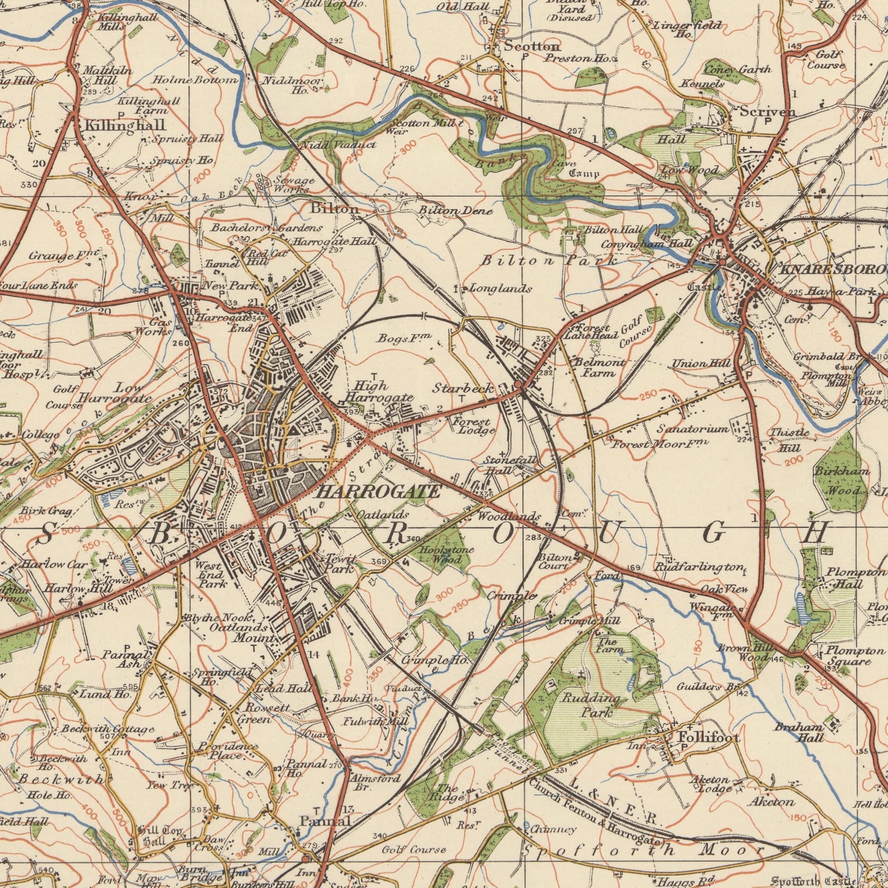 Mapa antiguo de Ordnance Survey, hoja 26: Harrogate, 1925: Otley, Ilkley, Skipton, Knaresborough, Nidderdale AONB