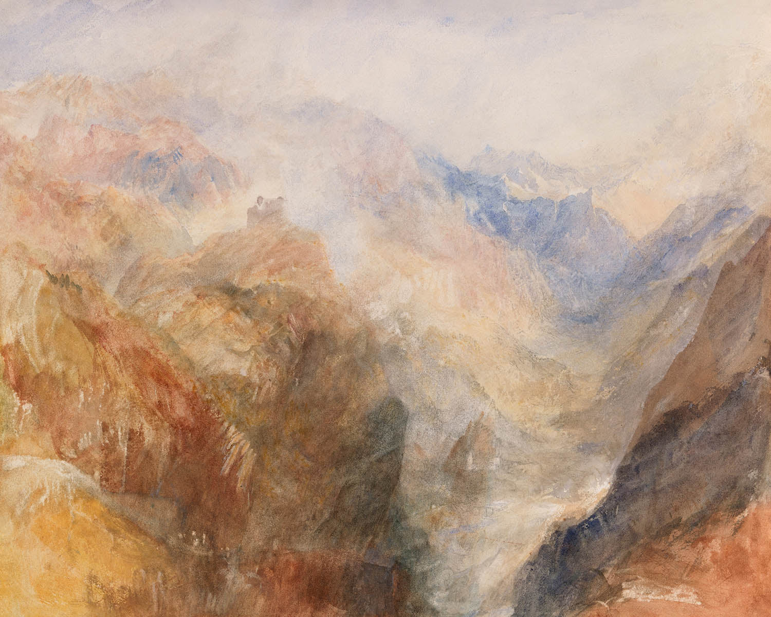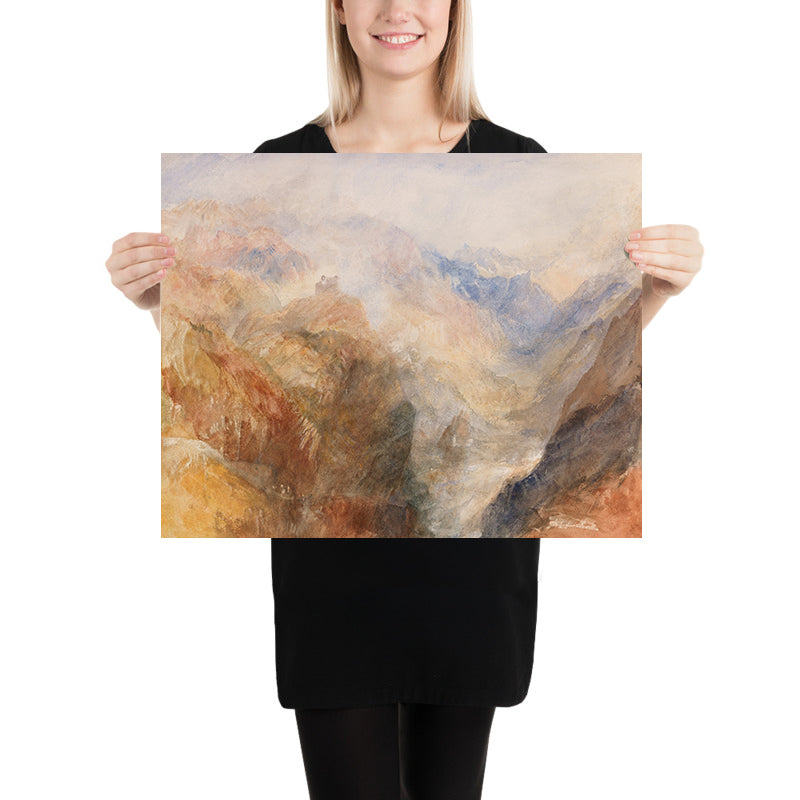 Color is the quiet protagonist here. A radiant field of yellows and ochres warms the composition, while notes of red animate rock faces and sunstruck slopes. Wisps of soft blue and white hover in the distance, lending cool equilibrium to the heat of the foreground. Turner’s fluid, layered washes, blurred transitions, and atmospheric perspective invite contemplation, making this an exceptional piece for serene bedrooms, light-filled living spaces, or study walls that benefit from a sense of depth and calm.
