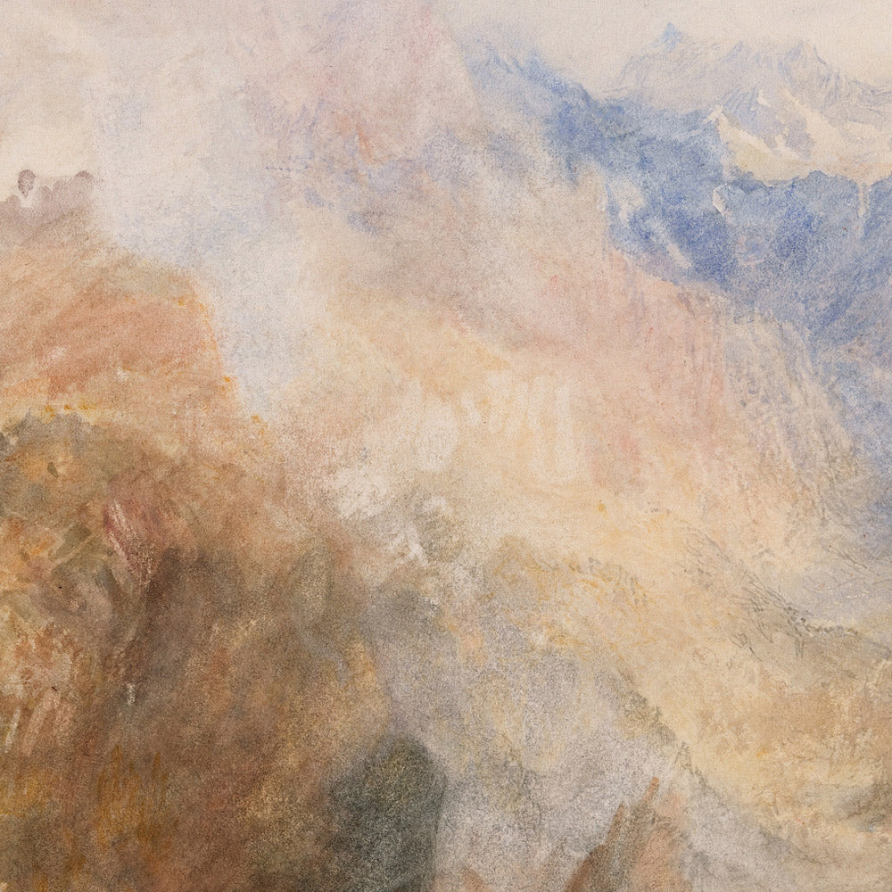 Turner—often called the “painter of light”—was one of Britain’s greatest Romantic artists. Celebrated for his radical handling of watercolor and oil, he transformed landscape into a vehicle for emotion and awe. By the 1830s his travels through the Alps honed a masterful grasp of atmosphere, transparency, and distance, influencing generations of landscape painters.