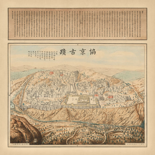 El "Mapa de [vista antigua] Jerusalén" es una cautivadora litografía a color a mano que te transporta a la época de Jesús, ofreciendo una representación detallada y artística de la ciudad santa. Creado en 1886 por los impresores jesuitas en Tushanwan, Shanghái, este mapa fue diseñado para ayudar a los creyentes cristianos chinos a estudiar y venerar los sitios sagrados asociados con la vida y el sufrimiento de Jesús. Las traducciones chinas de los nombres de los lugares en el mapa proporcionan un puente cultural único, convirtiéndolo en un fascinante artefacto de importancia religiosa e histórica.