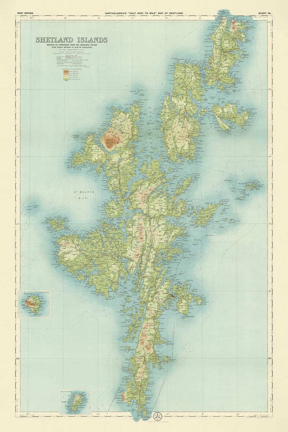 La hoja 29 - Islas Shetland, elaborada por el ilustre J.G. Bartholomew en 1901, es una representación magistral del arte y la precisión cartográfica. Conocido como el "Príncipe de los Cartógrafos", el trabajo de Bartholomew es celebrado por su uso innovador del color y su meticuloso detalle. Este mapa, parte de su renombrada serie de media pulgada por milla, fue diseñado pensando en ciclistas y turistas, ofreciendo una representación vívida y accesible de las Islas Shetland. El diseño claro y atractivo del mapa, junto con sus características políticas y físicas detalladas, lo convirtió en una pieza emblemática de la estimada colección de Bartholomew.