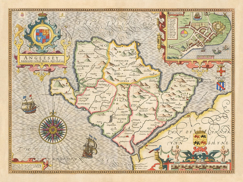 En la parte superior derecha hay un grabado detallado de Beaumaris, que fue la ciudad condado de Anglesey.