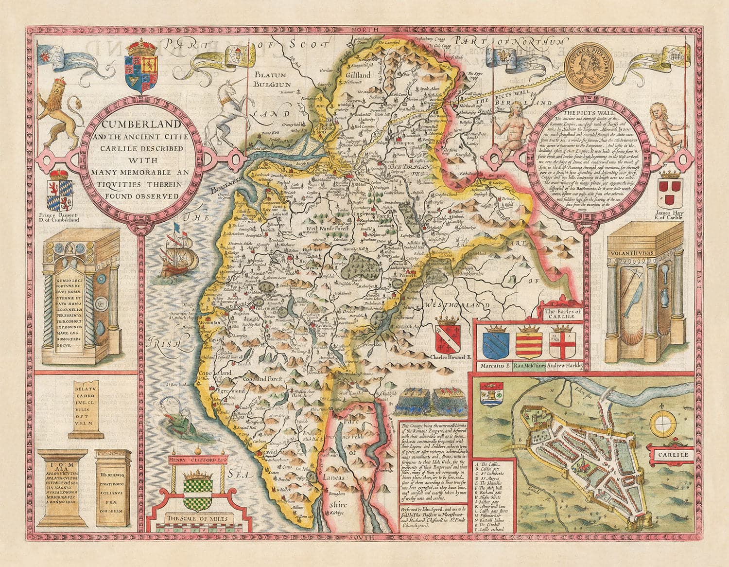 Viejo mapa de Cumbria, 1611 de John Speed - Cumberland, Carlisle, Keswick, Lake District, Windermere