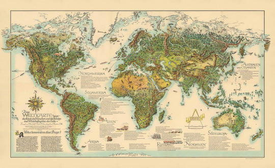 Step into the vibrant world of post-war cartography with Otto Wommelsdorff’s “Diese Weltkarte zeigt die Arbeit des Menschen und die Schätze und Wirtschaftsgüter der Erde,” a masterful pictorial map from circa 1950. Created in the wake of World War II, this map is a testament to the era’s renewed focus on global economic recovery and interconnectedness. Wommelsdorff’s vision is brought to life through intricate illustrations that celebrate the “work of man” and the bountiful “treasures and economic goods of the earth,” offering a captivating window into the hopes and priorities of a world rebuilding itself.