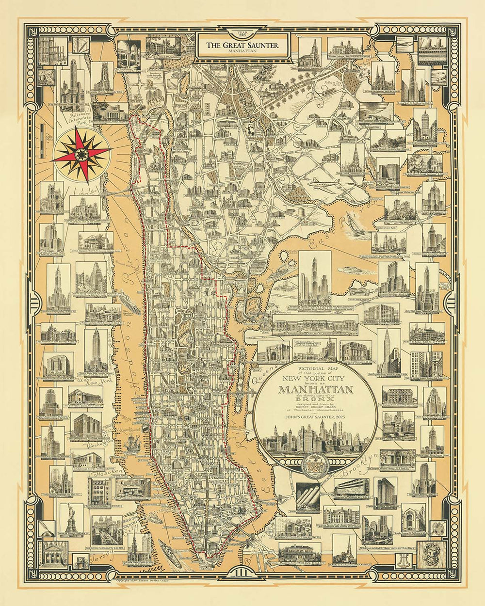 Manhattan: The Great Saunter, Route Map by The Unique Maps Co. and Chase, 1939: Personalisable, Central Park, Statue of Liberty, Empire State Building, Harlem