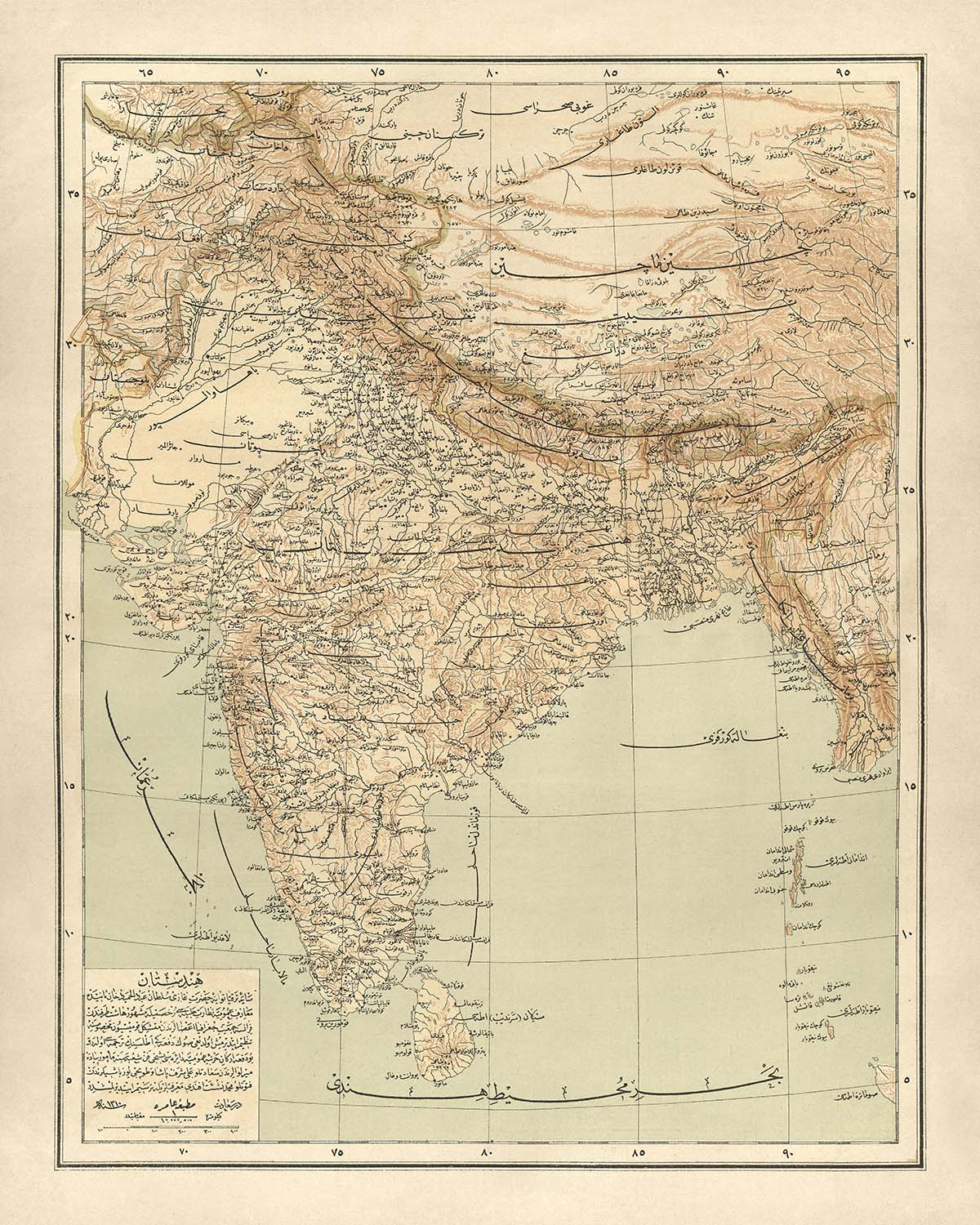 Old Arabic Map of India by Hafiz Ali Esref, 1894: Mumbai, Delhi, Kolkata, Himalayas, Ganges, Railroads