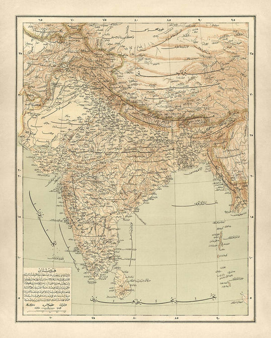 Step into the intricate world of late 19th-century cartography with the map titled "Hindistan = India," a masterwork created in 1894 by the esteemed Ottoman cartographer Ali Seref Pasa. This map, published in Ottoman script, forms part of a prestigious New Geographical Atlas of the World—a testament to the era’s pursuit of geographical knowledge and artistic excellence. Its original title, elegantly inscribed, signals both the scope and cultural lens through which the Indian subcontinent and its neighboring regions were viewed by the Ottoman intelligentsia at the twilight of the empire.