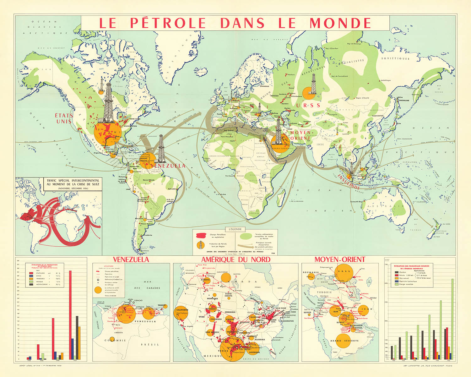 Old French World Map of the Global Petroleum Industry, 1958: Suez Crisis Impact, Oil Fields, Mid-Century Cartography