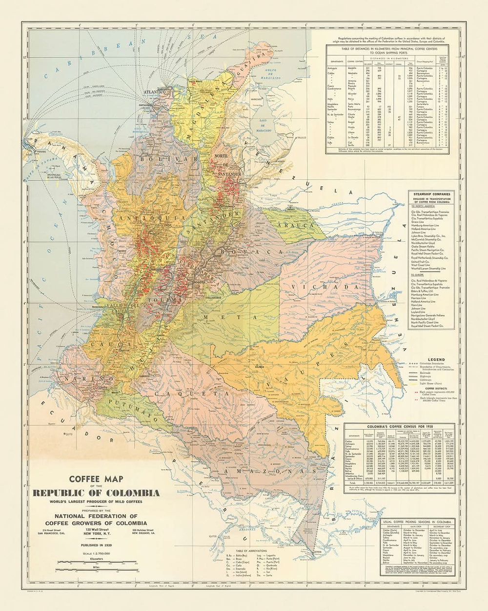 El mapa ofrece una visión detallada de Colombia, destacando sus regiones productoras de café y la infraestructura que sustenta esta vital industria. Incluye tablas y leyendas que ofrecen información sobre las distancias desde los principales centros cafetaleros hasta los puertos de embarque marítimo, así como sobre las compañías navieras que transportaban el café colombiano a Europa y América. El mapa también presenta el "Censo Cafetero" de 1938, que ofrece una visión fascinante del paisaje agrícola de la época.