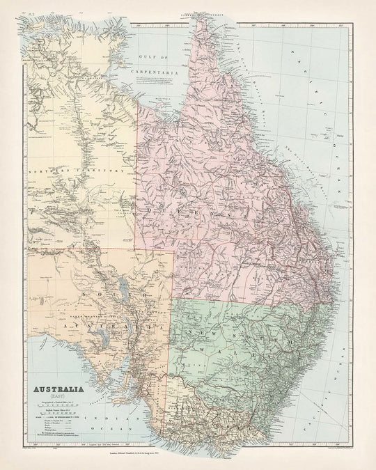 La importancia histórica de este mapa es profunda, ya que forma parte de un atlas considerado el mejor de su época. Captura un momento en el tiempo cuando Australia estaba evolucionando rápidamente, tanto política como geográficamente. Como pieza de colección, ofrece una oportunidad única de poseer un fragmento de la historia, proporcionando una visión del pasado mientras sigue siendo una obra de arte atemporal. El mapa "Australia (Este)" de Edward Stanford es más que una representación de la tierra; es una narrativa de exploración, desarrollo y transformación.