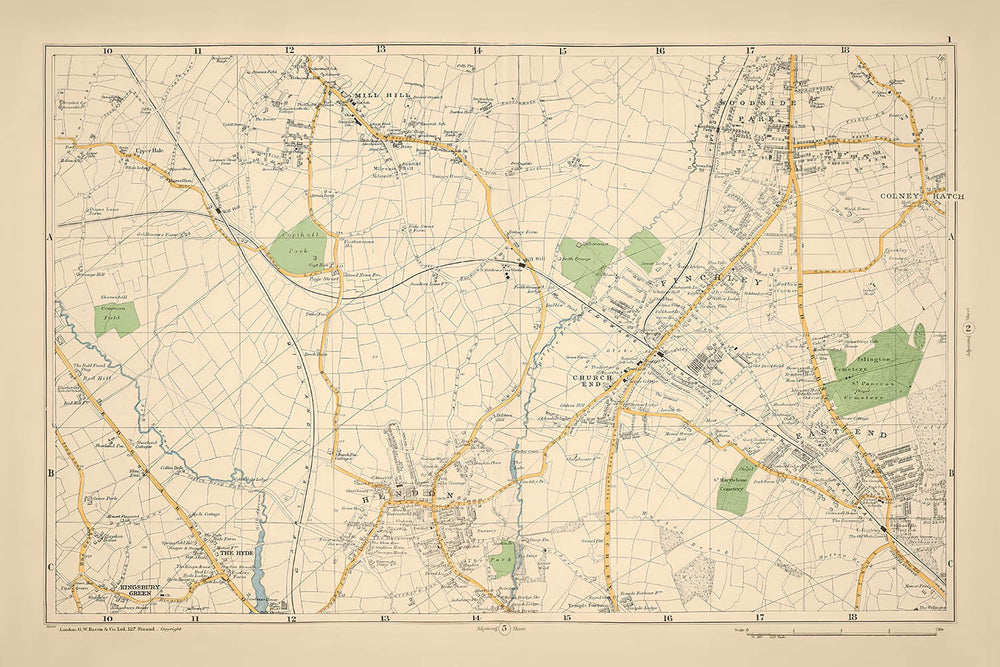 El mapa destaca barrios importantes como Mill Hill, Hendon, East End y Woodside Park, cada uno con su encanto único y su importancia histórica. Estas áreas, capturadas con exquisito detalle, revelan el intrincado trazado de las calles y el floreciente desarrollo de la época. La cuidadosa atención a los detalles y los colores vibrantes típicos del trabajo de Bacon & Co. hacen que estos barrios cobren vida, ofreciendo una mirada al pasado que es a la vez educativa y visualmente impactante.