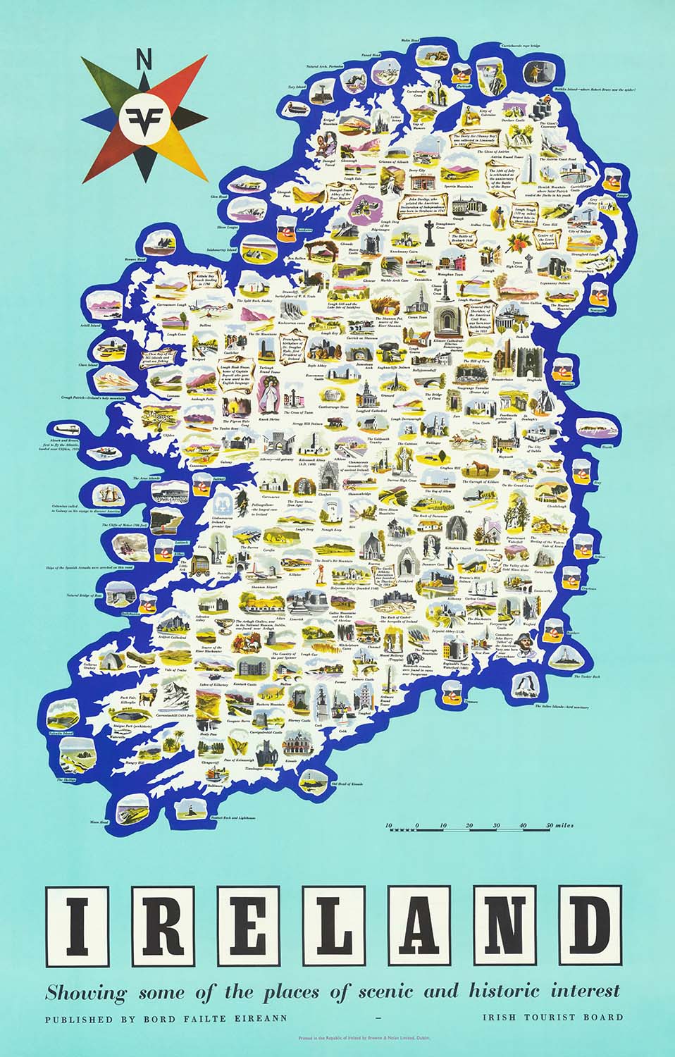 El mapa fue impreso por Browne and Nolan Limited en Dublín, un testimonio de la artesanía y atención al detalle de su época. Sirve tanto como una guía funcional como una expresión artística, reflejando las aspiraciones turísticas de la era. La Junta de Turismo de Irlanda, conocida como Bord Fáilte Éireann, buscó capturar la imaginación de los viajeros, animándolos a descubrir los encantadores relatos y vistas de Irlanda.