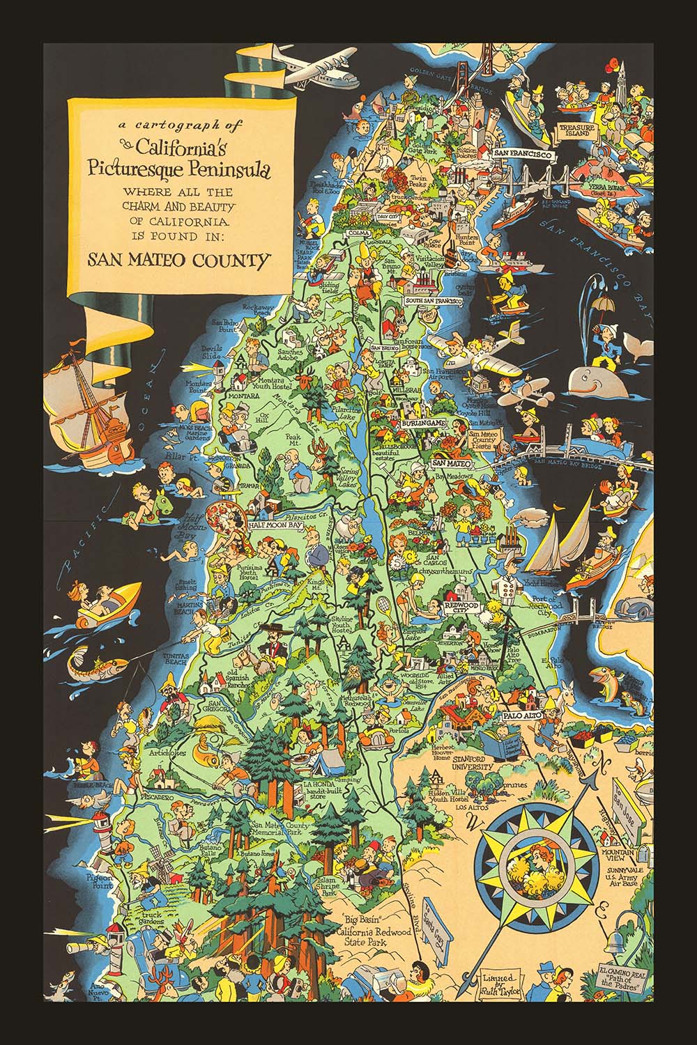Step into the enchanting world of early 20th-century California with Ruth Taylor White’s whimsical 1930 pictorial map, “A Cartograph of California’s Picturesque Peninsula where all the Charm and Beauty of California is Found in: San Mateo County.” This captivating map offers a vibrant snapshot of San Mateo County as it appeared during a transformative era, blending artistic flair with historical insight. White’s celebrated style—characterized by lively illustrations, bold colors, and playful caricatures—brings the county’s scenic coastline, rolling hills, and bustling towns to life, making this piece both a work of art and a valuable historical document.