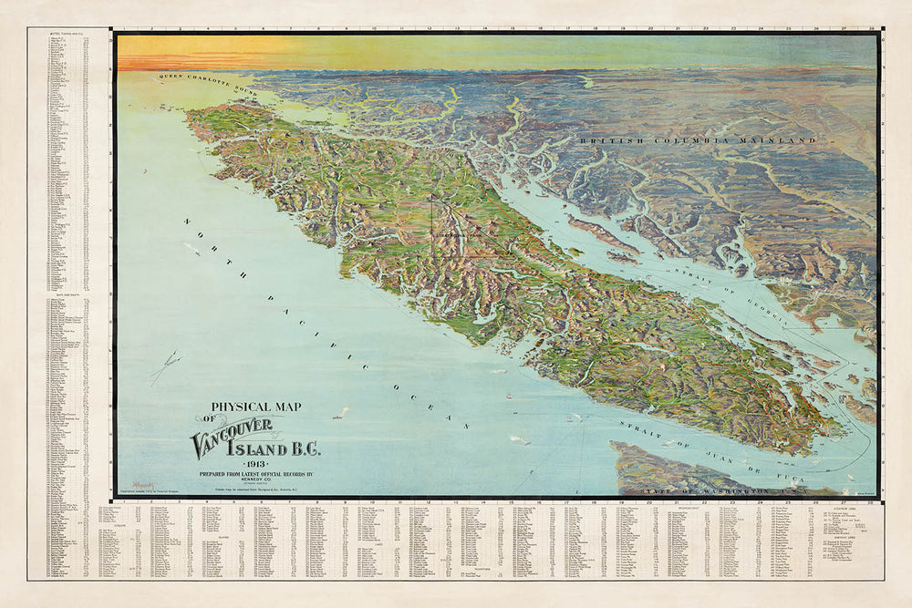 The map’s artistic style combines both utility and elegance, with carefully rendered topographical features such as mountain ranges, rivers, lakes, and the island’s dramatic coastline. Major towns like Victoria, Nanaimo, and Alberni are clearly labeled, alongside smaller settlements and outposts, providing a comprehensive overview of Vancouver Island’s human geography as it stood in 1913. The inclusion of a detailed index in the margins further enhances the map’s navigational value, making it an indispensable resource for historians and collectors alike.
