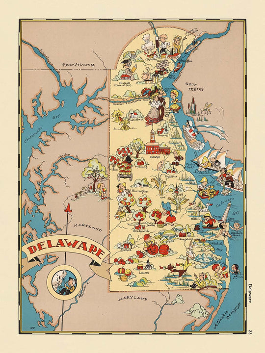 Step into the vibrant world of 1930s Americana with “Delaware,” an original pictorial map crafted by the renowned Ruth Taylor White in 1935. This exceptional work is more than a geographical representation; it is a celebration of Delaware’s unique identity, rendered in a style that blends historical reverence with whimsical artistry. The map’s original title, simply “Delaware,” hints at its focus: an intimate, detailed exploration of the First State, capturing its spirit through a colorful tapestry of illustrations. As part of a larger series of state maps, this piece stands out for its ability to encapsulate both the essence and the evolution of Delaware at a pivotal moment in American history.