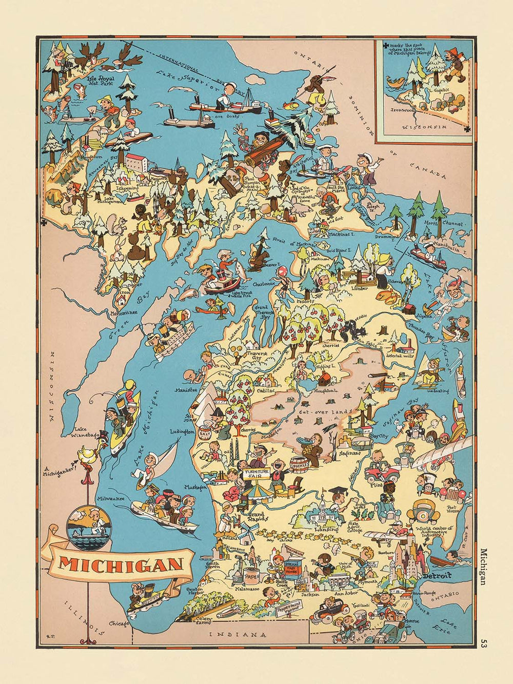 Pictorial Map of Michigan by Ruth Taylor White, 1935: Detroit, Great Lakes, Lumber, Autos, Orchards, Recreation
