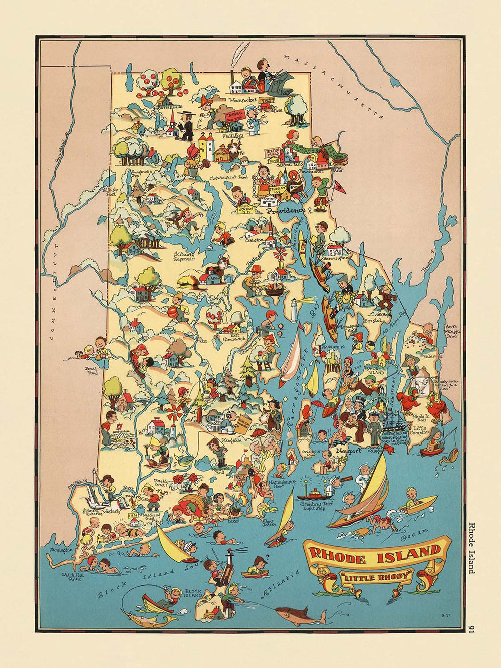 Pictorial Map of Rhode Island by Ruth Taylor White, 1935: Providence, Newport, Narragansett Bay, Lighthouses, Textile Mills