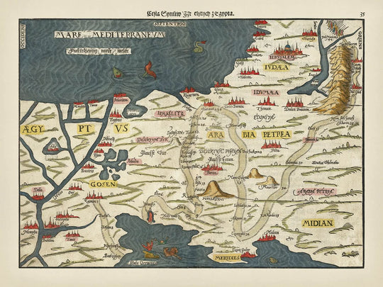 La importancia histórica de este mapa radica en su capacidad para transportar al espectador a una era pasada, donde el viaje espiritual de los israelitas se desarrolló contra un telón de fondo de desiertos, montañas y mares. La inclusión por parte de Bunting de lugares clave como el Monte Sinaí, Gosén y Madián proporciona un contexto geográfico que enriquece nuestra comprensión de la narrativa bíblica. Este mapa es una ventana al pasado, ofreciendo perspectivas sobre el entorno cultural y religioso de finales del siglo XVI, cuando las historias bíblicas eran parte integral de la conciencia colectiva.