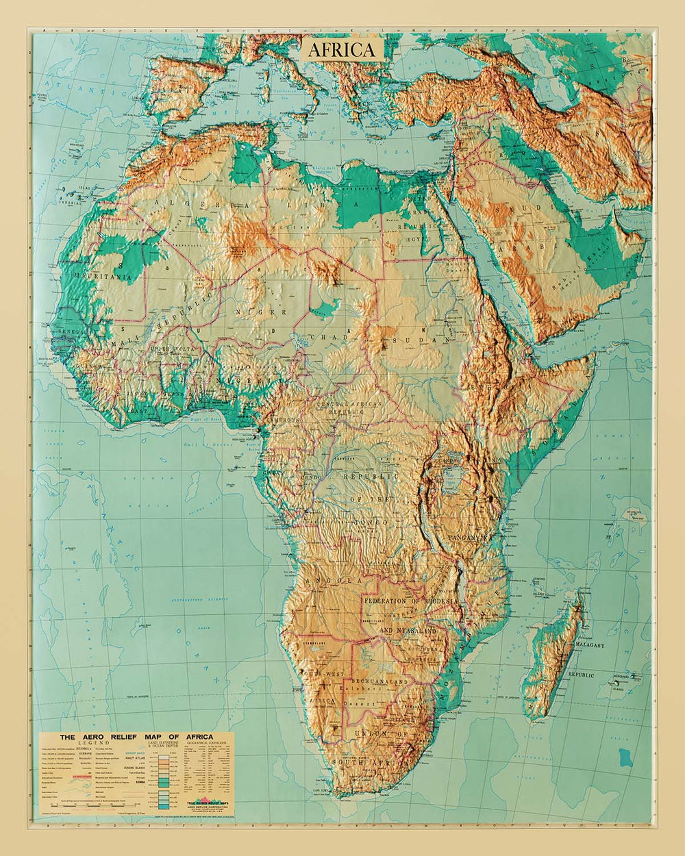 Antigua mapa topográfico en 3D de África por Aero Service Corporation, 1961