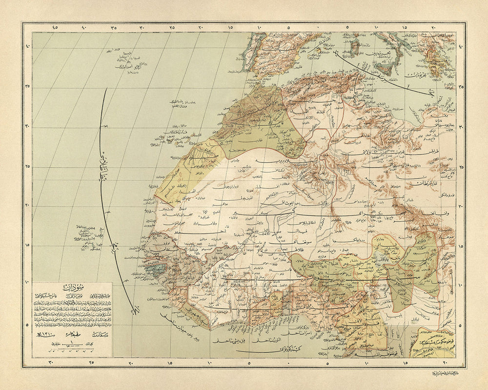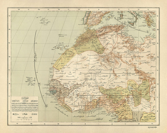 Sumérgete en el rico tapiz del noroeste de África a través de la lente del notable "Harita-i Afrika-i Garbiyye ve Sudan", una obra maestra elaborada por el estimado Hafiz Ali Esref en 1894. Este exquisito mapa, testimonio de la excelencia cartográfica de su era, ofrece una visión incomparable de la geografía política y física de una región llena de historia y diversidad cultural. Hafiz Ali Esref, un ex soldado convertido en cartógrafo jefe, perfeccionó sus habilidades en París antes de tomar el mando de la prestigiosa Matbaa-i Amire Press en Beyazit. Su meticulosa atención al detalle y su profundo conocimiento de la geografía se muestran vívidamente en esta obra, que se extiende desde las bulliciosas calles de Marrakech hasta los serenos paisajes del Sahara, encapsulando la esencia del noroeste de África con notable precisión.