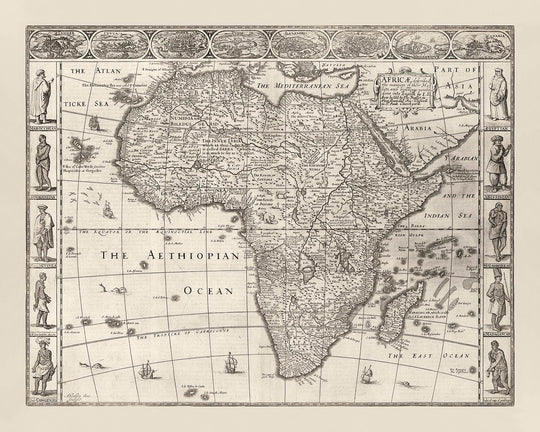 El mapa es un testimonio de los temas y tópicos que fascinaron a la Europa moderna temprana, ilustrando los paisajes políticos y físicos de África con una precisión notable. Capta la inmensidad del continente, desde el mar Mediterráneo en el norte hasta los misteriosos reinos del "Océano Etíope" en el sur. El mapa también hace alusión al rico tapiz cultural de África, con representaciones de atuendos locales y escenas de la vida cotidiana a lo largo de sus márgenes, ofreciendo una visión de las diversas sociedades que prosperaron en todo el continente.