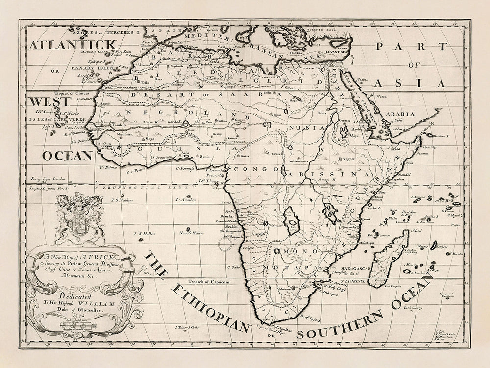 Un antiguo mapa de África que muestra cómo era el continente, a los ojos de los cartógrafos europeos, hace más de 300 años. Había una falta de conocimiento sobre los innumerables países dentro de las regiones del continente en el siglo XVIII, a pesar de que la forma general, las islas circundantes y la costa del país estaban muy bien mapeadas.