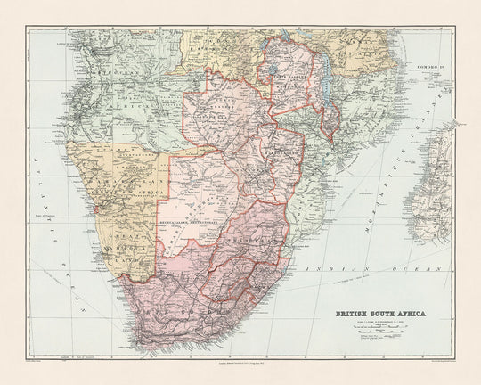 Como mapa de país, la "Sudáfrica británica" ofrece una perspectiva intrigante de la región durante un período de cambios históricos significativos. Capta la inmensidad de las posesiones africanas del Imperio Británico, mostrando la escala y la complejidad de gestionar una gama tan diversa de territorios. Por lo tanto, este mapa no es sólo una representación geográfica, sino un artefacto histórico, una narrativa de la influencia y el alcance del Imperio Británico en África. Es una pieza fascinante para cualquiera interesado en la geografía histórica, la historia colonial o el intrincado tapiz del pasado de África.