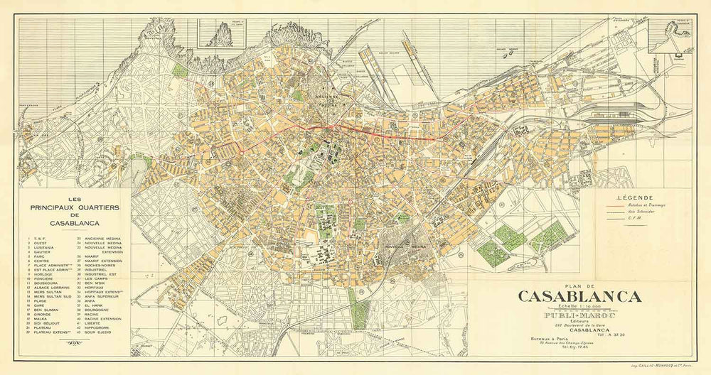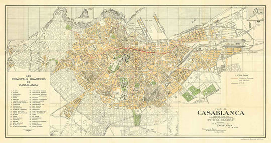 Este es un mapa muy detallado del centro económico y de negocios de Marruecos. La ciudad, que fue ocupada por los franceses durante el tiempo en que se publicó el mapa, es el principal puerto de Marruecos y es bien conocida como el escenario de la película "Casablanca".