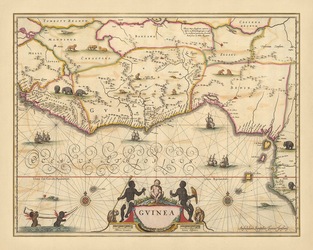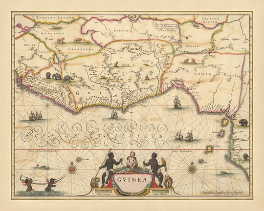 Este mapa es más que un simple artefacto histórico; es una narrativa visual que invita a la exploración y el descubrimiento. Desde las ciudades meticulosamente detalladas hasta los fenómenos naturales bellamente representados, cada elemento sirve para transportar al espectador al pasado. Si es un entusiasta de la historia, un amante de la cartografía o simplemente aprecia la belleza de los mapas antiguos, este mapa de 'Guinea' de Nicolaes Visscher II seguramente será una adición cautivadora a su colección.