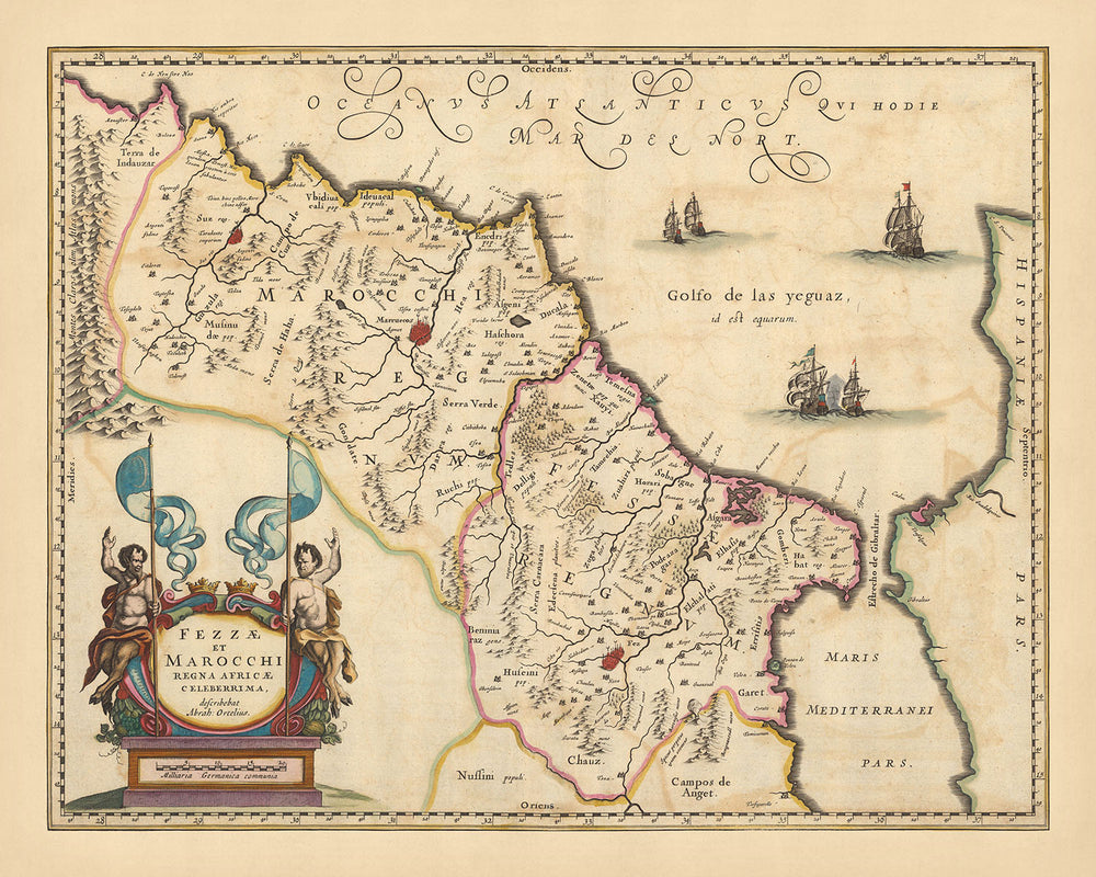 Sumérgete en el rico tapiz de la historia con el exquisito mapa 'Fezzae et Marocchi regna Africae celeberrima, describebat Abrah', una creación magistral del renombrado cartógrafo Nicolaes Visscher II. Traducido al inglés, el título significa "Los reinos más famosos de Fez y Marrakech en África, descritos por Abraham". Este mapa, que data de 1690, ofrece una vista detallada de las regiones de Fez y Marrakech, junto con la zona más amplia de Marruecos, una tierra llena de cultura e historia.
