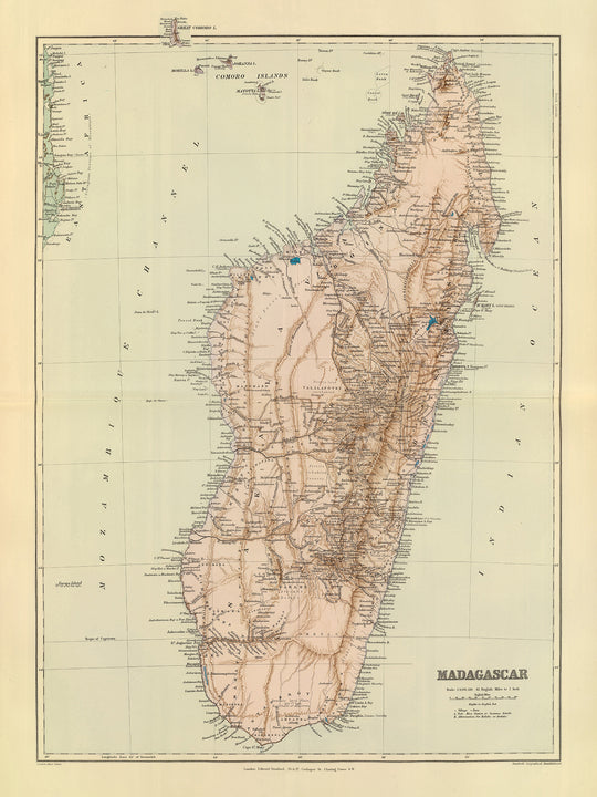 Edward Stanford fue un reconocido cartógrafo y editor británico que produjo algunos de los mapas más precisos y detallados de finales del siglo XIX y principios del XX. Este mapa de Madagascar se publicó en 1901, pocos años después de que se estableciera la colonia francesa de Madagascar.