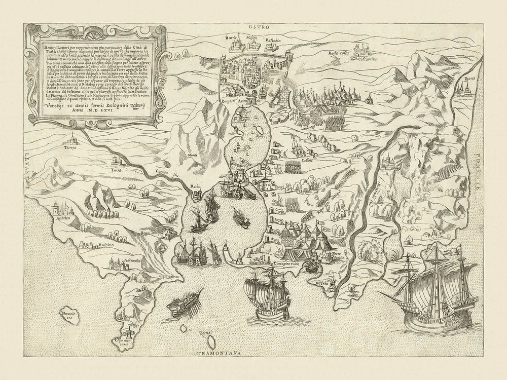 El arte de Zaltieri es evidente en las detalladas ilustraciones de campamentos militares y batallas navales, dando vida a la tensión y el drama del asedio. El mapa se basa en la rara obra de Agostino de Musi, ofreciendo una representación temática del triunfo de la flota cristiana. La representación de poderosos barcos, como el galeón portugués São João Baptista, destaca la destreza naval que fue crucial para romper el bastión otomano. Este mapa sirve como un testimonio de las maniobras estratégicas y alianzas que definieron esta victoria histórica.