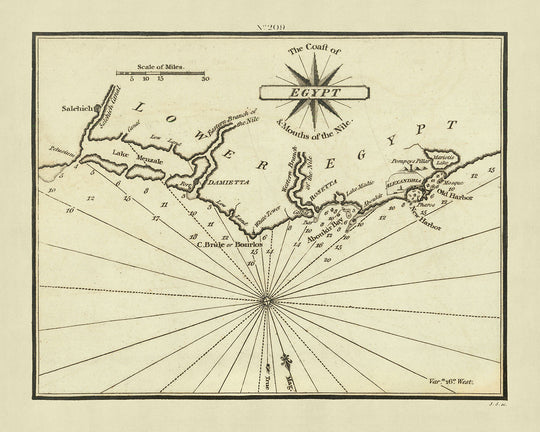 El diseño del mapa es tanto funcional como estéticamente agradable, presentando una rosa de los vientos clásica y una escala de millas que ejemplifican los estándares cartográficos de la época. Estos elementos no solo añaden utilidad al mapa, sino también su encanto, capturando la esencia de la exploración marítima durante el período. La cuidadosa representación de las bocas del Nilo y la topografía circundante ofrece un retrato vívido de la geografía de la región, convirtiéndolo en una valiosa herramienta educativa para aquellos interesados en la historia natural y política del área.