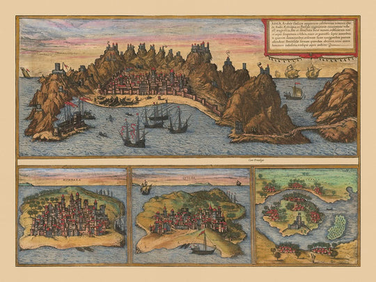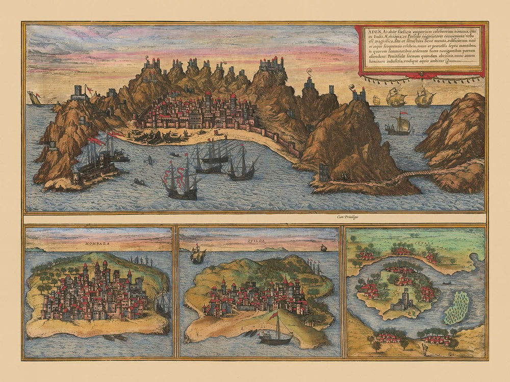 Antigua Mapa Pictórico de Adén por Braun & Hogenberg, 1572: Mombasa, Kilwa, Sofala, Fortificaciones, Puertos, Barcos
