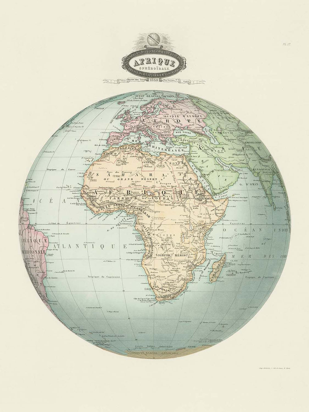 Además de su valor artístico, el mapa es un testimonio del conocimiento geográfico del siglo XIX. Representa con precisión los principales cuerpos de agua como el océano Atlántico, el océano Índico y el mar Mediterráneo, junto con importantes cadenas montañosas como las montañas Atlas. La inclusión del ecuador, el trópico de Capricornio y el trópico de Cáncer subraya aún más la precisión científica del mapa. Estas características proporcionan valiosas ideas sobre las prácticas cartográficas y la comprensión geográfica de la época.