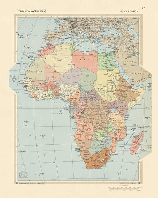 El estilo artístico del cartógrafo es evidente en el mapa 'África - Política'. El estilo de mapa político detallado es un testimonio de la meticulosa artesanía y dedicación del Servicio de Topografía del Ejército Polaco. Cada país está claramente delineado, con fronteras distintas que representan con precisión las divisiones políticas de la época. El diseño del mapa es tanto funcional como estéticamente agradable, con una mezcla armoniosa de colores que distinguen diferentes regiones mientras mantienen una apariencia general cohesiva.