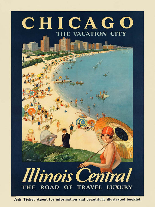 Chicago. The Vacation City by Paul Proehl invites you to the sunlit shores of Lake Michigan at the height of the Art Deco era. Commissioned for the Illinois Central Railroad, this classic travel poster sells the city as a breezy beach resort: the headline CHICAGO THE VACATION CITY crowns a sweeping view of the curving lakefront, lively with umbrellas and sailboats, and a smartly dressed bather in an orange swimsuit and parasol in the foreground. The message at the base—Illinois Central: The Road of Travel Luxury—captures the glamour of American rail travel when Chicago was the nation’s stylish gateway to the Midwest.