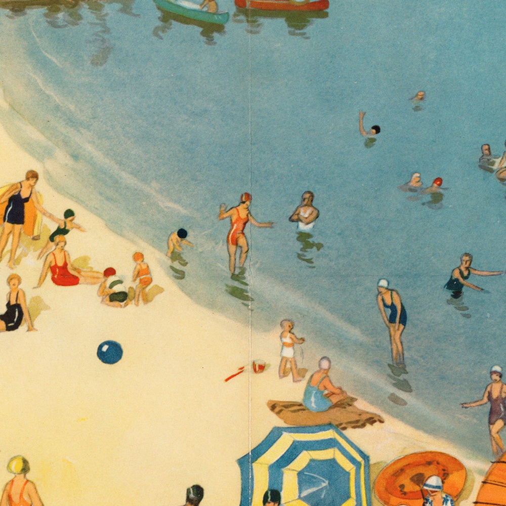 About the artist: Paul Proehl was an American commercial illustrator active in the early twentieth century, known for atmospheric posters and advertising artwork for major clients, including Midwestern railroads. His signature—PROEHL—appears on the original art, and his style blends painterly beach scenes with refined, high-impact typography that epitomizes the travel-poster aesthetic.