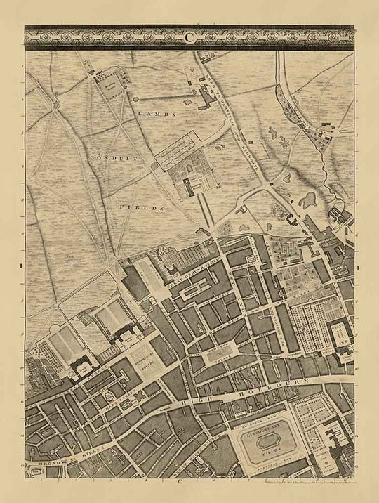 Este mapa fue publicado originalmente en 24 hojas. El mapa mostrado aquí es la hoja C1, que se centra en las áreas al norte y al sur de High Holborn y las partes más centrales del distrito de Camden. Algunas de las ubicaciones clave mostradas en este mapa incluyen Lincoln's Inn Fields, Bloomsbury Square, el área que se convertiría en Russell Square, Great Ormond Street (pero el hospital aún no está allí), Red Lyon Square, el espacio que se convertiría en el Museo Británico (aquí solo hay campos y jardines), Gray's Inn road y square, y muchos más.