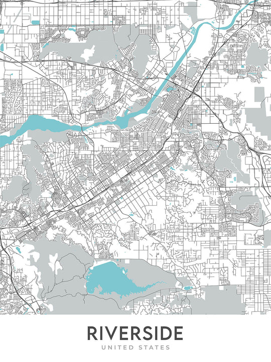 Riverside es una ciudad que combina a la perfección lo antiguo y lo nuevo, lo natural y lo creado por el hombre. Este mapa resume maravillosamente esta coexistencia armoniosa, mostrando los verdes parques y paisajes escénicos de la ciudad junto con sus bulliciosos centros urbanos. El río Santa Ana serpentea por la ciudad, añadiendo un elemento de tranquilidad al paisaje urbano.