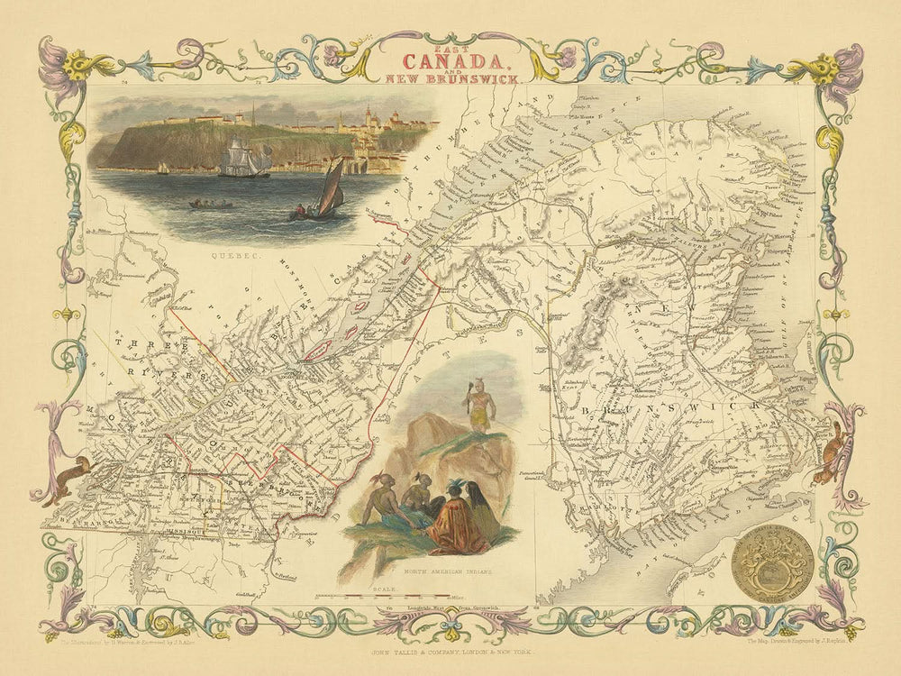Este mapa ofrece una vista detallada del este de Canadá y Nuevo Brunswick, mostrando los paisajes políticos y físicos de mediados del siglo XIX. Los condados y municipios están delineados de forma intrincada, con fronteras marcadas en rojo vibrante, lo que ofrece una visión de las divisiones administrativas de la época. El mapa está adornado con viñetas decorativas, incluida una ilustración cautivadora de Quebec, que resalta la importancia cultural e histórica de esta ciudad icónica.
