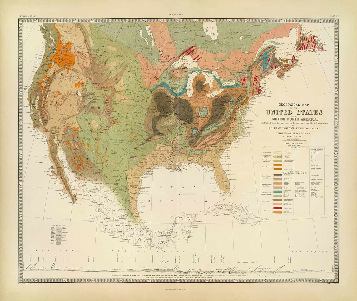 Antiguo mapa geológico de EE.UU. y Canadá por Rogers & Johnston, 1856: Geological Chart of America