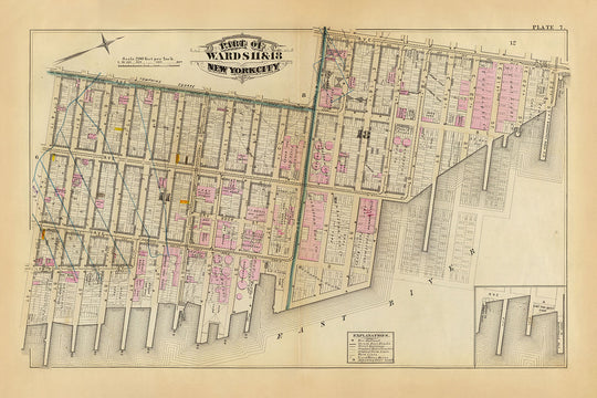 El mapa cubre un área conocida por sus vibrantes comunidades de inmigrantes y calles bulliciosas. Detalla meticulosamente las líneas agrícolas originales que alguna vez demarcaron las parcelas rurales, junto con la cuadrícula en expansión de una Nueva York en rápida urbanización. Lugares industriales notables como Morgan Iron Works y Hotchkiss, Field & Co. Iron Works se exhiben de manera destacada, lo que sirve como testimonio del auge industrial de la época. Los límites de los distritos están claramente marcados, lo que proporciona una idea de las divisiones administrativas de la ciudad de la época.