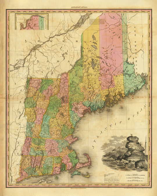 Mapa antiguo de Nueva Inglaterra por H. S. Tanner, 1820: Boston, Providence, Hartford, Portland, Worcester