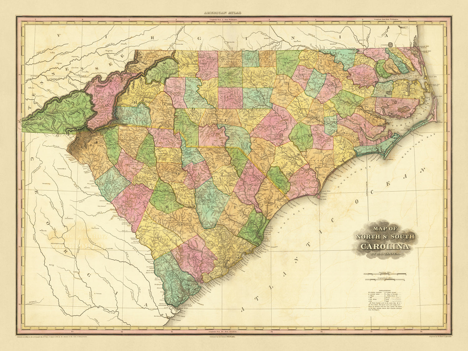 Mapa antiguo de Carolina del Norte y del Sur de Tanner, 1823: Charleston, Columbia, Charlotte, Raleigh y Wilmington